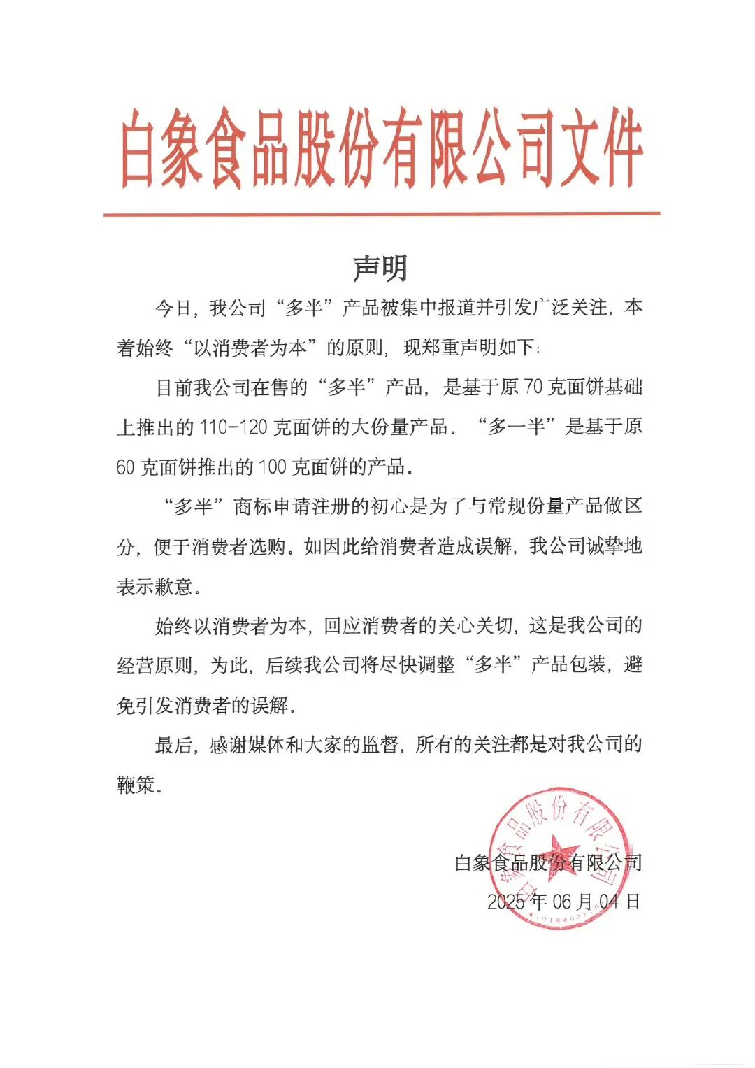 今日,我公司“多半”产品被集中报道并引发广泛关注,本着始终“以消费者为本”的原则,现郑重声明如下: