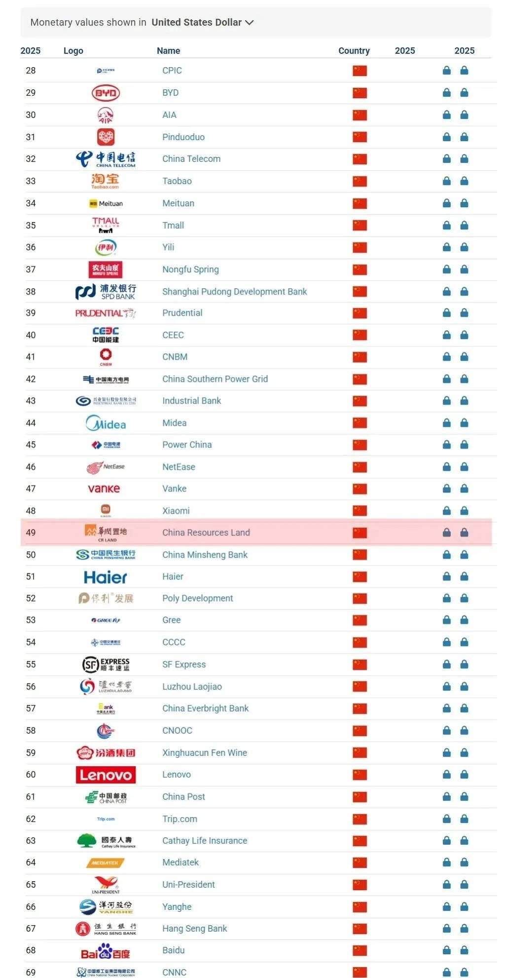 其中,华润置地凭借其卓越的综合实力名列第49位,较上年度提升3位,品牌价值达71.49亿美元。